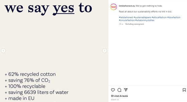 De sociale (deel)economie is in opmars. Denk maar aan auto’s delen met Poppy of je eigen appartement verhuren met Airbnb. En dit zorgt er dus voor dat bedrijven steeds vaker voor andere doelen gaan kiezen dan louter commerciële. En ze laten ons ook zien dat ze daarin succesvol kunnen zijn. De sociale mediaconsument is een belangrijke speler hierin, want die houdt namelijk van merken op sociale media die het verschil maken in de wereld. Echt een verschil maken. Een sterk voorbeeld is het jeansmerk HNST, een Belgisch bedrijf dat duurzame jeans produceert in Europa. Heel het businessmodel is gericht op een maatschappelijk doel; jeans maken die niet schadelijk zijn voor het klimaat. Elke jeans van HNST wordt gemaakt van minstens 62% gerecycleerd katoen en is zelf 100% recycleerbaar. Dat noemen we een social brand.