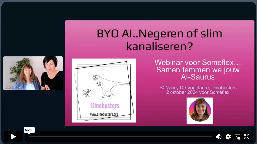 Tijdens een online expertsessie bij Someflex ging Nancy De Vogelaere (Dinobusters) dieper in op dit thema. Zij benadrukte dat AI altijd een copiloot moet zijn: een waardevolle assistent, maar nooit de autopiloot.