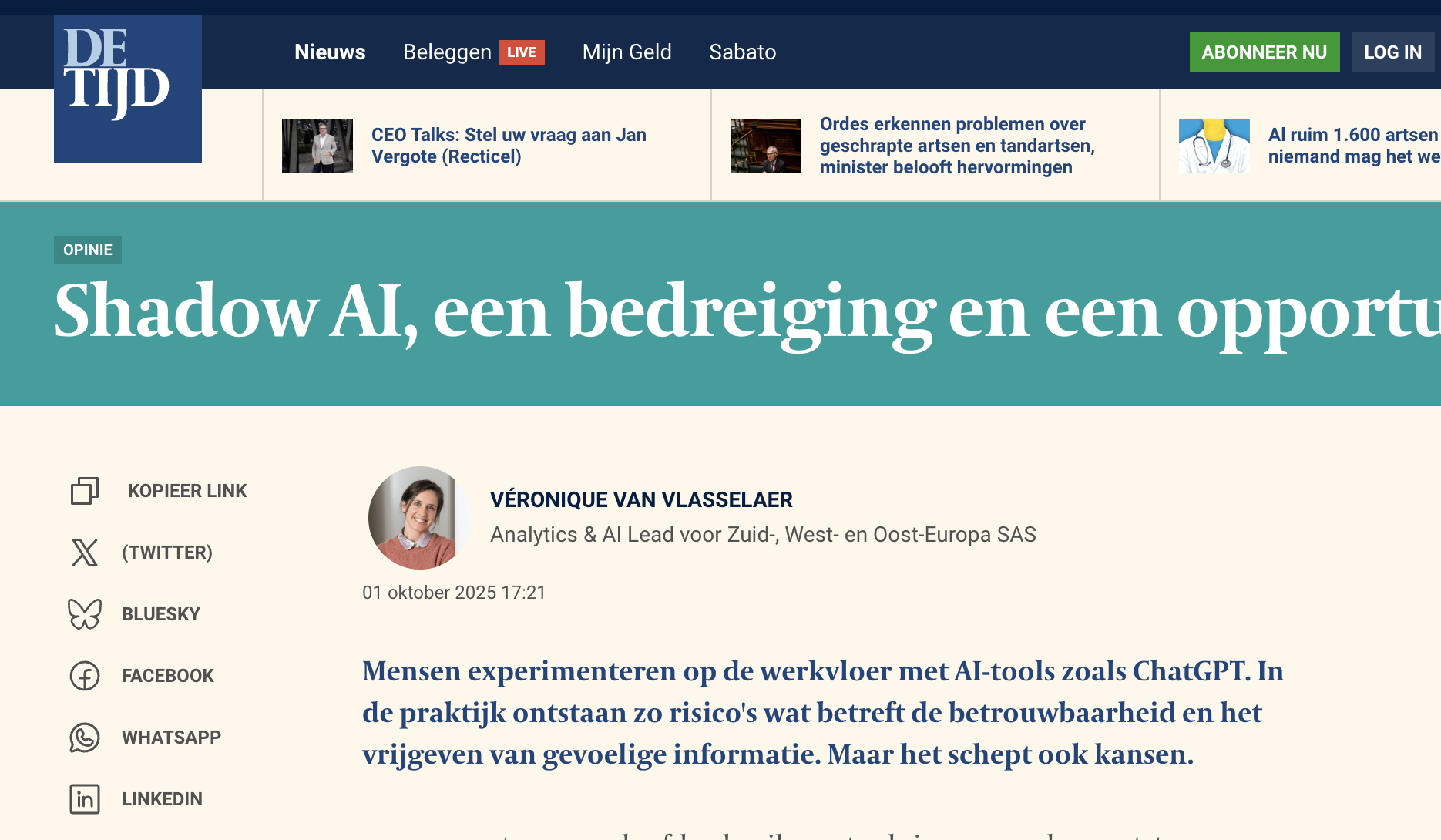 👉 Lees het volledige artikel in De Tijd: Shadow AI, een bedreiging en een opportuniteit