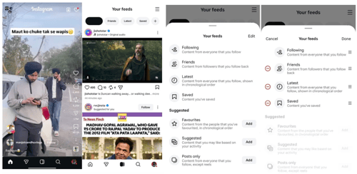 Your Feed is bereikbaar via een nieuw icoon in het midden van de onderste navigatiebalk. Het tabblad "Home" opent bovenaan met vastgezette Stories, gevolgd door een eindeloos scrollende Reels-feed. Jij swipet gewoon naar de feedoptie die jij wilt. Simpel, overzichtelijk en eindelijk persoonlijk.