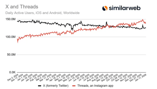 Threads groei met dagelijks gebruik op mobiel. Volgens nieuwe cijfers heeft Threads wereldwijd nu meer actieve mobiele gebruikers dan X.