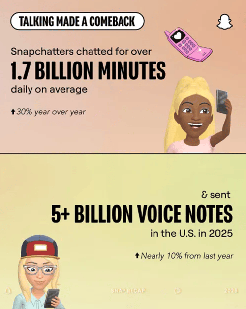Snappers praten samen ongeveer 1,7 miljard minuten per dag in de app. Dat is 30% meer dan vorig jaar. En het zijn vaak geen lange gesprekken. Eerder van die snelle check-ins: “Waar ben je?” “Kom je mee?” “Leg dit even uit.”
