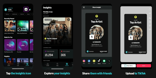 Je kunt nu nummers, albums, playlists, Amazon Music Originals en Amazon Music Insights rechtstreeks naar TikTok delen. Insights bevatten onder andere Monthly Recaps, topartiesten, meest beluisterde nummers, podcasts en totale luisterminuten. Deze statistieken worden trouwens automatisch omgezet naar deelbare TikTok-content.