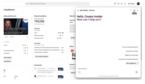 YouTube introduceert ook “Ask Studio”. Een ingebouwde AI-assistent waarmee je vragen kunt stellen over je kanaal, prestaties of instellingen. Denk aan: “Waarom daalt mijn kijktijd?” of “Hoe presteren mijn Shorts?”. De AI geeft direct antwoord op basis van je data.