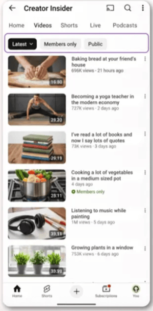 YouTube voegt tegelijk nieuwe filteropties toe op kanaalpagina’s. Je kunt nu sorteren op ‘Members only’ of ‘Public’ content.