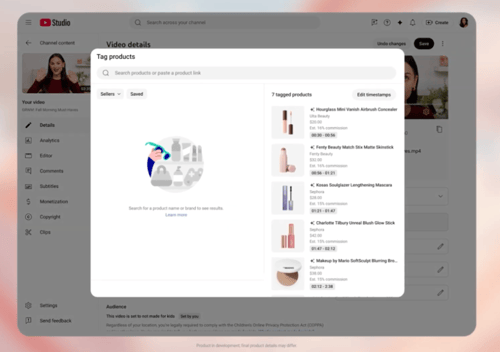 En er is nog meer! YouTube vergroot de mogelijkheden voor makers om producten in hun video's te promoten. Als je meer dan 20.000 abonnees hebt, kun je producten van ruim 50 merken, zoals Nordstrom en Sephora, in je video's en Shorts tonen, en een mooie commissie opstrijken als een kijker het product koopt.